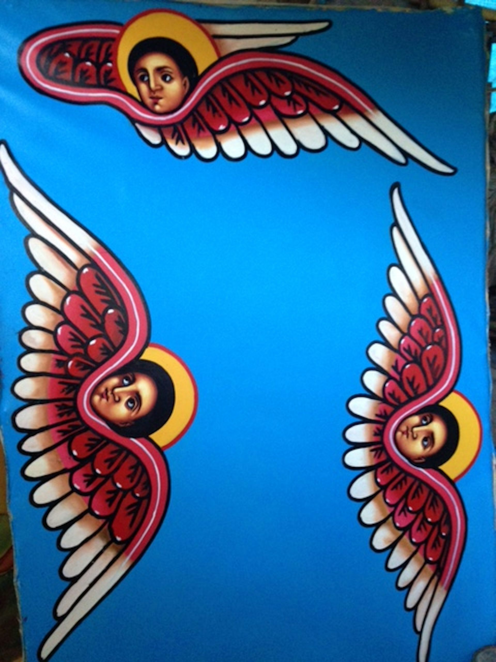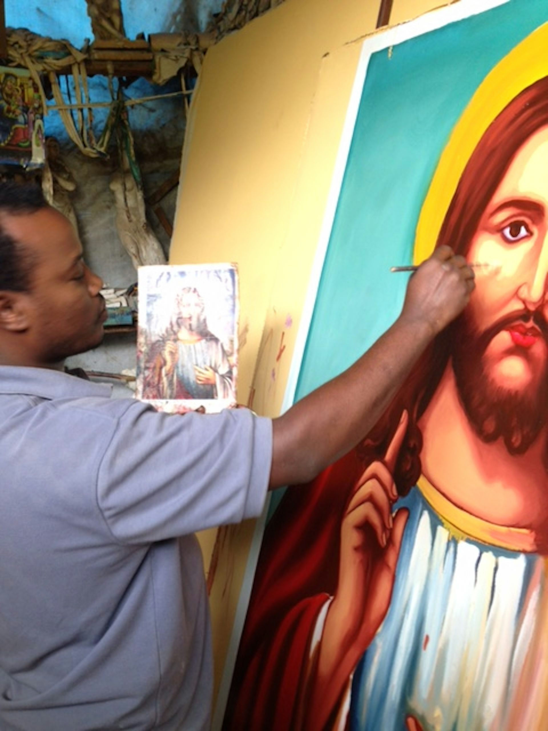 Le premier d’entre eux est Zewdu, peintre d’une imagerie chrétienne orthodoxe, commissionné par l’Église éthiopienne orthodoxe Tewahedo (EOTC), l’une des églises orthodoxes orientales de l’Éthiopie. Je le considère comme se rangeant dans une catégorie « normative », c’est-à-dire qu’il suit un modèle d’images conforme à ce que l’Église juge « acceptable ».